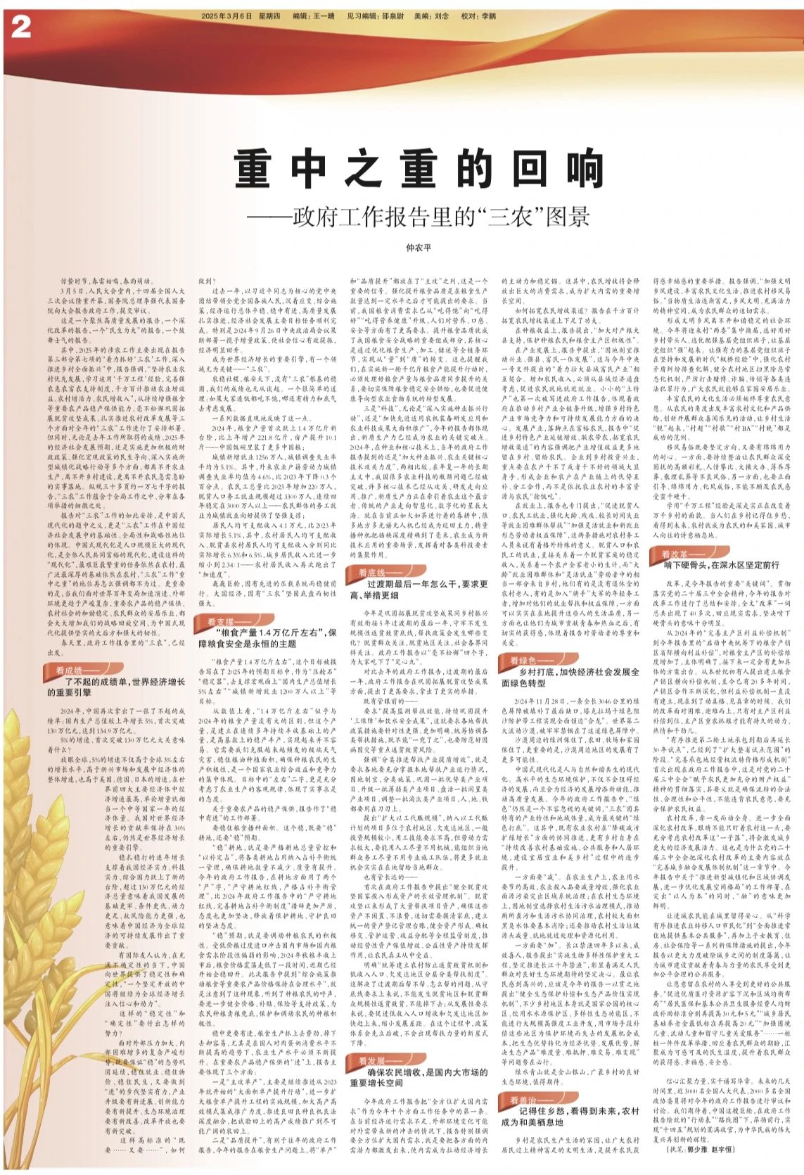 其中,2025年的涉農(nóng)工作主要出現(xiàn)在報(bào)告第三部分第七項(xiàng)的“著力抓好‘三農(nóng)’工作,深入推進(jìn)鄉(xiāng)村全面振興”中,報(bào)告強(qiáng)調(diào),“堅(jiān)持農(nóng)業(yè)農(nóng)村優(yōu)先發(fā)展,學(xué)習(xí)運(yùn)用‘千萬工程’經(jīng)驗(yàn),完善強(qiáng)農(nóng)惠農(nóng)富農(nóng)支持制度,千方百計(jì)推動(dòng)農(nóng)業(yè)增效益、農(nóng)村增活力、農(nóng)民增收入”,從持續(xù)增強(qiáng)糧食等重要農(nóng)產(chǎn)品穩(wěn)產(chǎn)保供能力、毫不松懈鞏固拓展脫貧攻堅(jiān)成果、扎實(shí)推進(jìn)農(nóng)村改革發(fā)展等三個(gè)方面對(duì)全年的“三農(nóng)”工作進(jìn)行了安排部署。但同時(shí),無論是去年工作所取得的成績、2025年的經(jīng)濟(jì)社會(huì)發(fā)展預(yù)期,還是實(shí)施更加積極的財(cái)政政策、強(qiáng)化宏觀政策的民生導(dǎo)向、深入實(shí)施新型城鎮(zhèn)化戰(zhàn)略行動(dòng)等多個(gè)方面,都離不開農(nóng)業(yè)生產(chǎn),離不開鄉(xiāng)村建設(shè),更離不開農(nóng)民急需急盼的實(shí)事落地。縱觀三十多頁約一萬七千字的報(bào)告,“三農(nóng)”工作蘊(yùn)含于全局工作之中、分布在各項(xiàng)舉措的細(xì)微之處。