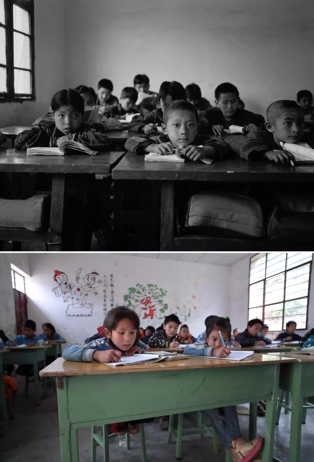 拼版照片:上圖是2007年10月24日,四川涼山彝族自治州布拖縣烏依鄉(xiāng)阿布洛哈村小學(xué)一年級(jí)學(xué)生在上課(林強(qiáng)攝);下圖是2017年1月6日,阿布洛哈村小學(xué)二年級(jí)學(xué)生在上課(新華社記者江宏景攝)。20世紀(jì)60年代,當(dāng)?shù)貙?00多名麻風(fēng)病人集中在阿布洛哈隔離治療,從此這里被叫做“麻風(fēng)村”。在社會(huì)各界的幫助下,這里發(fā)生了很大變化。新華社發(fā)