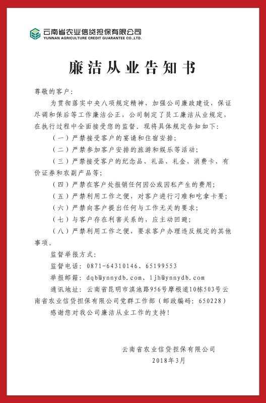 “一杯水”原則和《廉潔從業(yè)告知書(shū)》制度的實(shí)行,將對(duì)進(jìn)一步強(qiáng)化員工的廉潔自律意識(shí)和廉潔從業(yè)意識(shí),凈化公司廉政環(huán)境,加強(qiáng)公司廉政建設(shè),維護(hù)公司良好形象發(fā)揮積極作用,托起云南農(nóng)擔(dān)服務(wù)三農(nóng)綠色美好愿景,讓云南農(nóng)擔(dān)在實(shí)現(xiàn)云南經(jīng)濟(jì)跨越發(fā)展和服務(wù)三農(nóng)方面走得更高更遠(yuǎn),發(fā)揮更大作用。