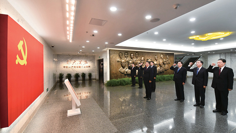 2017年10月31日,中共中央總書記、國家主席、中央軍委主席習(xí)近平帶領(lǐng)中共中央政治局常委李克強、栗戰(zhàn)書、汪洋、王滬寧、趙樂際、韓正,瞻仰上海中共一大會址和浙江嘉興南湖紅船。這是31日上午,在上海中共一大會址紀念館,習(xí)近平帶領(lǐng)其他中共中央政治局常委同志一起重溫入黨誓詞。