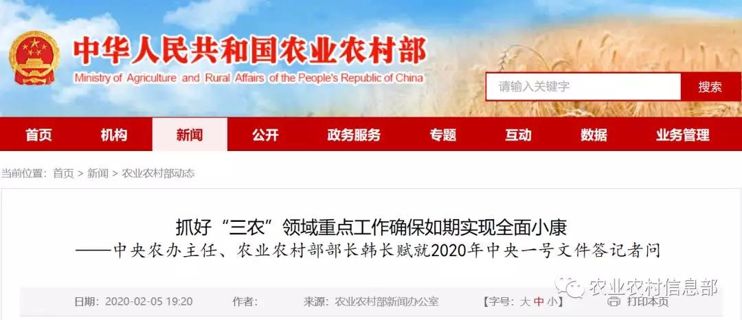 近日,中共中央、國(guó)務(wù)院印發(fā)《關(guān)于抓好“三農(nóng)”領(lǐng)域重點(diǎn)工作確保如期實(shí)現(xiàn)全面小康的意見(jiàn)》,也就是2020年中央一號(hào)文件。文件公開(kāi)發(fā)布之際,中央農(nóng)辦主任、農(nóng)業(yè)農(nóng)村部部長(zhǎng)韓長(zhǎng)賦就文件制定印發(fā)和貫徹落實(shí)等問(wèn)題,回答了記者的提問(wèn)。