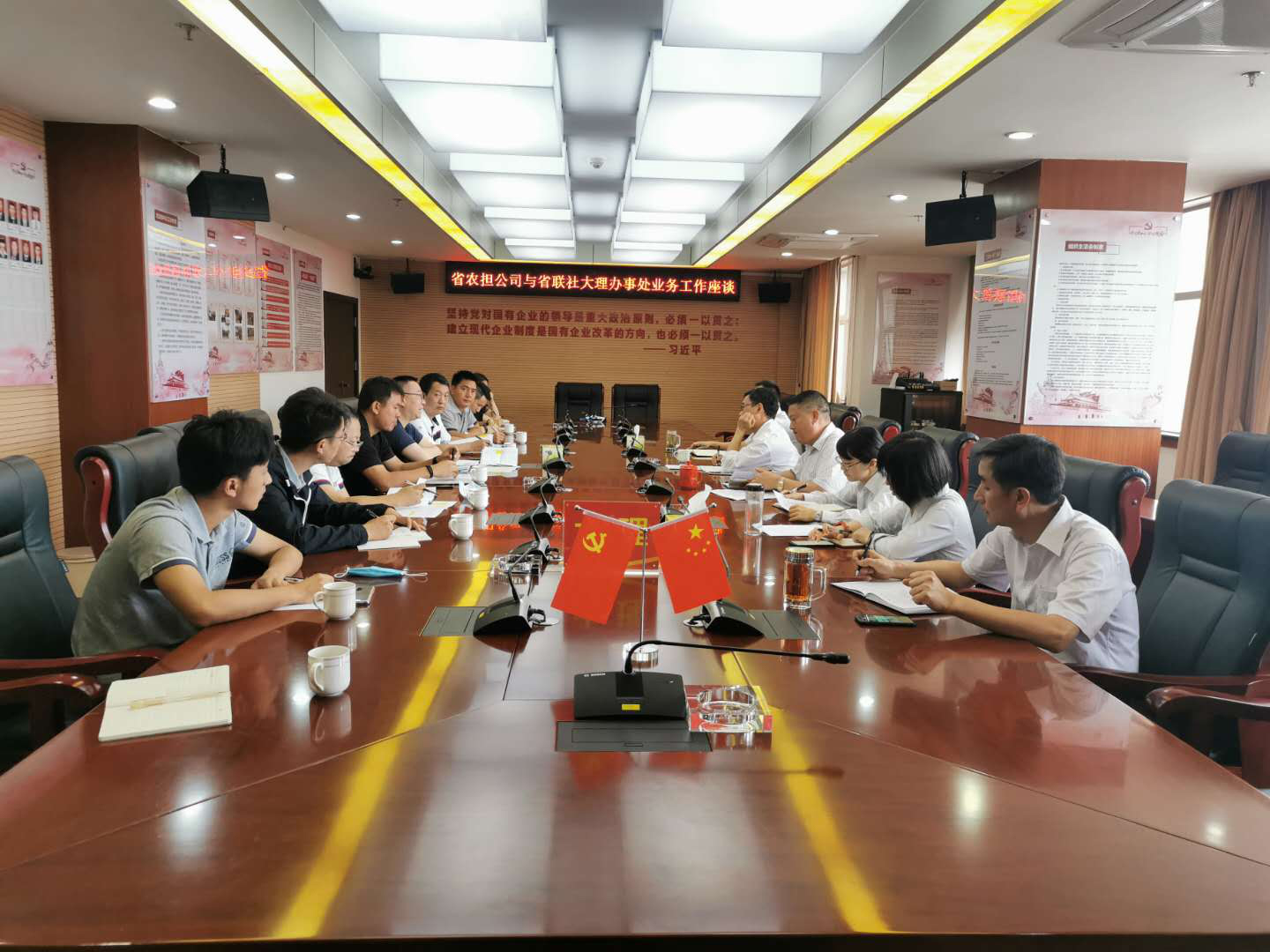 6月19日,調(diào)研組一行到省聯(lián)社大理辦事處座談。雙方就目前合作的情況以及業(yè)務(wù)進(jìn)行深入交流,省聯(lián)社大理辦事處黃景勝主任表示,通過此次交流活動,加強(qiáng)了雙方溝通互信,將依托大理州較好的信用環(huán)境,充分發(fā)揮信用社業(yè)務(wù)優(yōu)勢,加強(qiáng)與省農(nóng)擔(dān)公司合作,在風(fēng)險可控前提下積極擴(kuò)大農(nóng)擔(dān)業(yè)務(wù)覆蓋面。