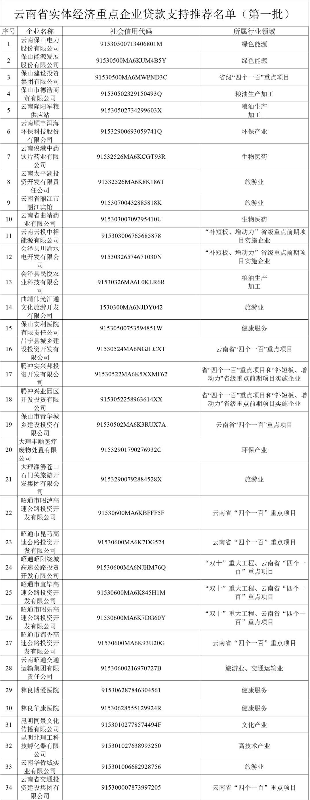 根據(jù)《云南省人民政府印發(fā)關(guān)于支持實體經(jīng)濟(jì)發(fā)展的若干措施的通知》、《云南省發(fā)展和改革委員會關(guān)于貫徹落實支持實體經(jīng)濟(jì)發(fā)展的若干措施實行貸款企業(yè)名單制管理有關(guān)事項的通知》要求,現(xiàn)將省發(fā)展改革委推送至省工業(yè)和信息化廳、省財政廳、省農(nóng)業(yè)農(nóng)村廳、省商務(wù)廳、省文化和旅游廳、省地方金融監(jiān)管局、省稅務(wù)局、人民銀行昆明中心支行、云南銀保監(jiān)局、云南證監(jiān)局,以及抄送相關(guān)金融機(jī)構(gòu)的《云南省實體經(jīng)濟(jì)重點企業(yè)貸款支持推薦名單》(第一批)予以公布。