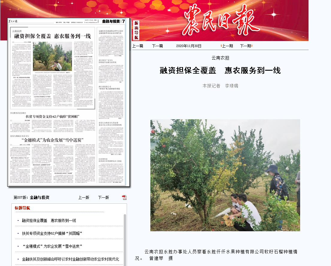 10月,國家農(nóng)擔(dān)公司微信公眾號“農(nóng)擔(dān)經(jīng)驗(yàn)談”專欄中對云南農(nóng)擔(dān)公司認(rèn)真貫徹落實(shí)云南省脫貧攻堅(jiān)等扶貧政策,支持麗江永勝縣農(nóng)業(yè)生產(chǎn)、帶動(dòng)貧困戶脫貧增收,積極為當(dāng)?shù)匦滦娃r(nóng)業(yè)經(jīng)營主體提供融資擔(dān)保服務(wù)進(jìn)行了宣傳?!掇r(nóng)民日報(bào)》從國家農(nóng)擔(dān)公司了解到云南農(nóng)擔(dān)支農(nóng)惠農(nóng)的相關(guān)情況后,11月30日以《融資擔(dān)保全覆蓋 惠農(nóng)服務(wù)到一線》為題報(bào)道了云南農(nóng)擔(dān)公司成立以來,不斷完善分支機(jī)構(gòu)布局,實(shí)現(xiàn)了機(jī)構(gòu)、業(yè)務(wù)和人員的全面下沉,形成了覆蓋全省的農(nóng)擔(dān)基層服務(wù)網(wǎng)絡(luò)體系,以點(diǎn)帶面、立足當(dāng)?shù)?,為推?dòng)縣域經(jīng)濟(jì)和云南高原特色農(nóng)業(yè)產(chǎn)業(yè)發(fā)展、推進(jìn)農(nóng)業(yè)供給側(cè)結(jié)構(gòu)性改革、助力脫貧攻堅(jiān)、助推“鄉(xiāng)村振興”戰(zhàn)略實(shí)施發(fā)揮了積極作用。