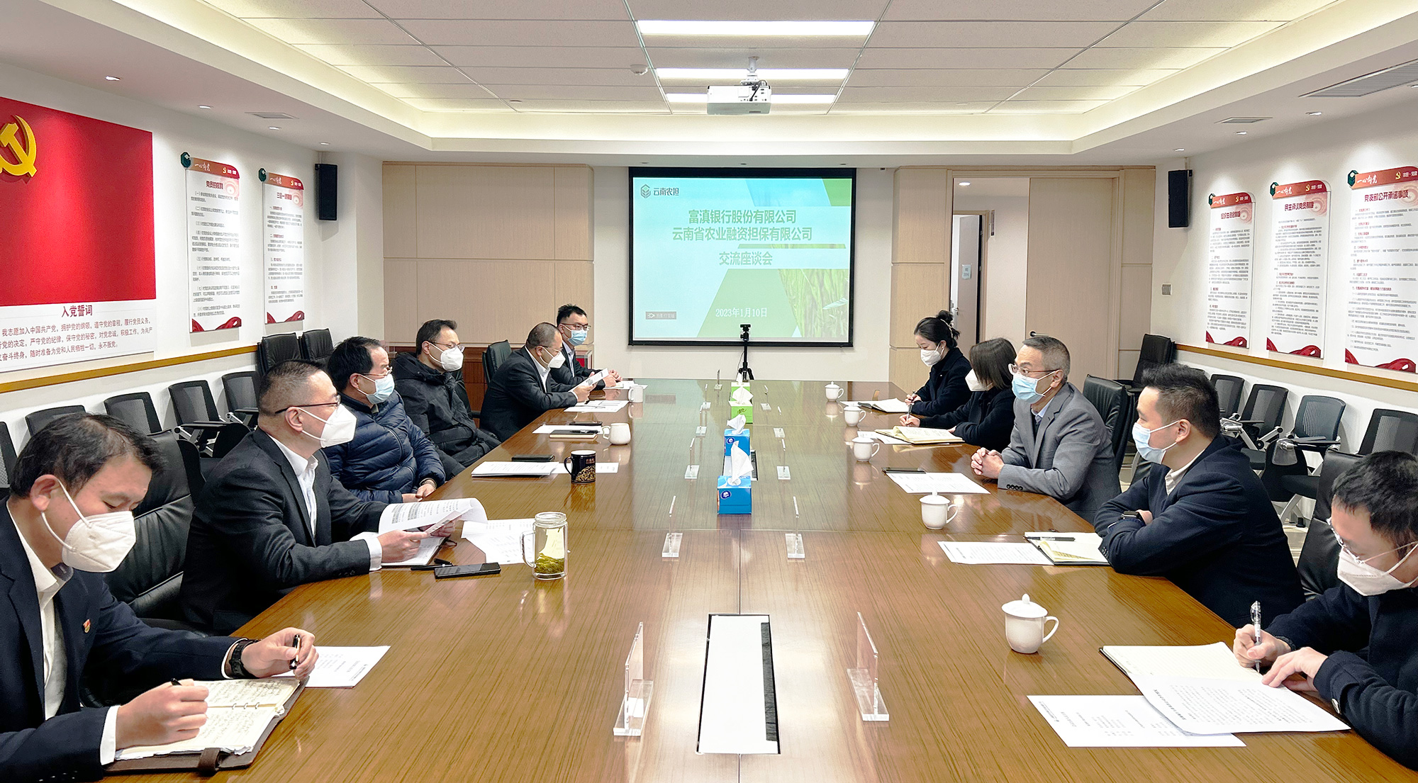 2023年1月10日,云南省農(nóng)業(yè)融資擔(dān)保有限公司與富滇銀行股份有限公司召開(kāi)銀擔(dān)合作座談會(huì)。富滇銀行黨委委員、副行長(zhǎng)納然,公司董事長(zhǎng)杜開(kāi)波、總經(jīng)理李世偉、副總經(jīng)理廖寅皓出席會(huì)議。會(huì)議圍繞2023年雙方合作目標(biāo)展開(kāi)討論,并就推進(jìn)下一步戰(zhàn)略合作達(dá)成共識(shí)。