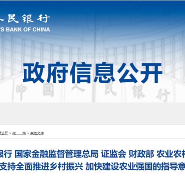 中國人民銀行、金融監(jiān)管總局、中國證監(jiān)會(huì)、財(cái)政部、農(nóng)業(yè)農(nóng)村部近日聯(lián)合發(fā)布《關(guān)于金融支持全面推進(jìn)鄉(xiāng)村振興 加快建設(shè)農(nóng)業(yè)強(qiáng)國的指導(dǎo)意見》。